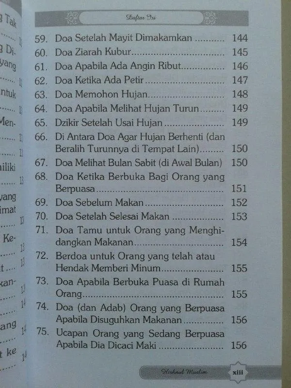 Terdapat 69 doa dan zikir merangkumi zikir umum doa-doa harian serta wirid-wirid yang boleh diamalkan sehari-hari. Himpunan Doa Agama Hindu. Syukur kepada Allah kerana dengan limpah kurnianya buku Perisai Muslim Himpunan doa dan zikir dari Al-Quran dan As-Sunnah yang disusun oleh Sheikh Dr.